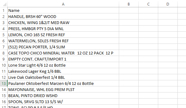 First open the Item export from Step 1. Ignore everything in the file accept for Column A, 'Name'. The contents of this list are all of your Items: