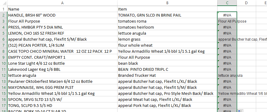 If the Item Name is NOT found, it will return a '#N/A' value in Column C. This means that the item is NOT currently on your stock count template. It would then need to be added.